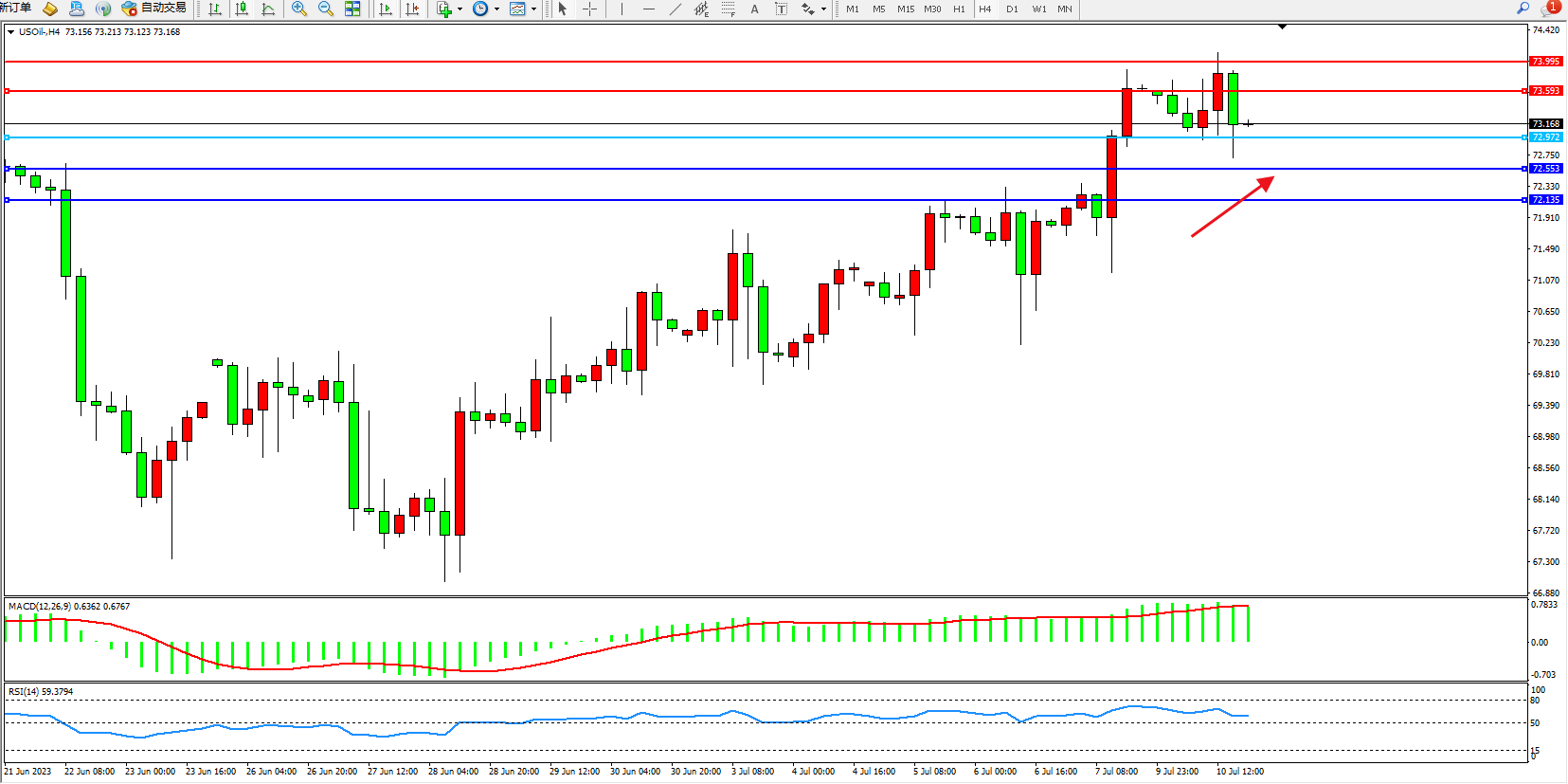 交易策略:72.972上方看涨,目标73.893 73.995