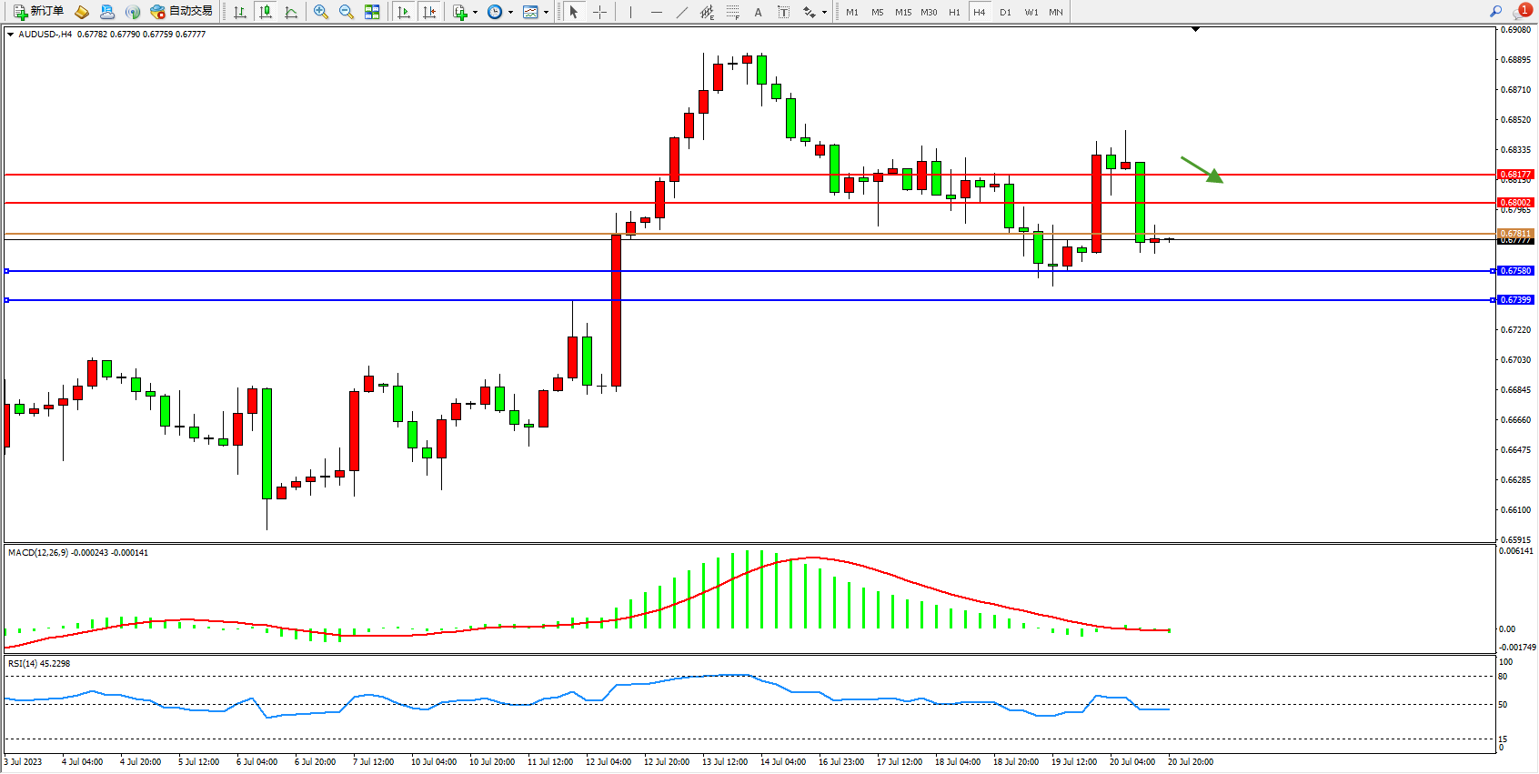 交易策略:0.67811下方看跌,目标0.67580  0.67399