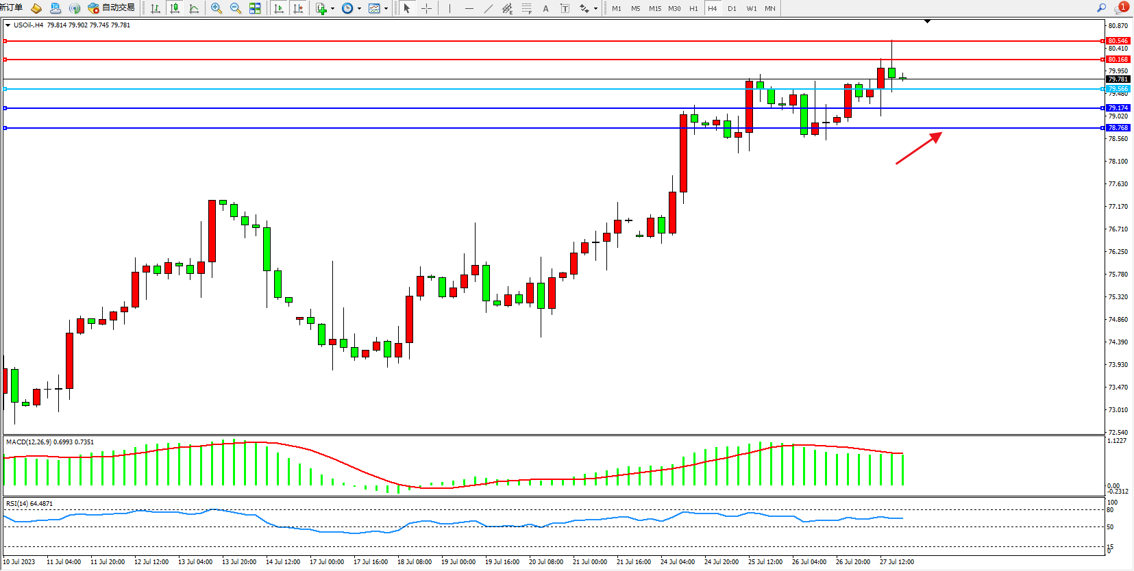 原油USOil——4小时K线图显示: