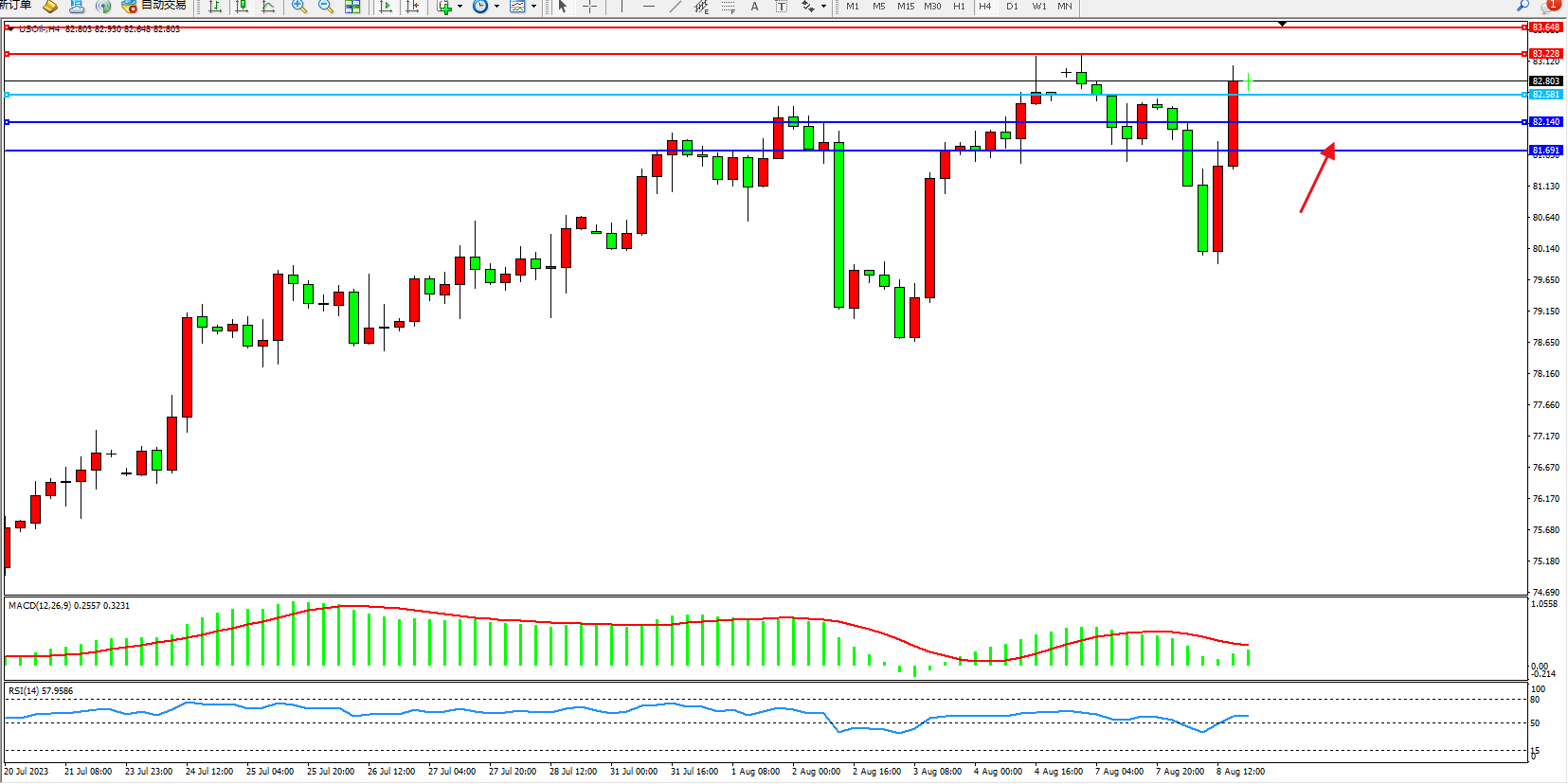 原油USOil——4小时K线图显示: