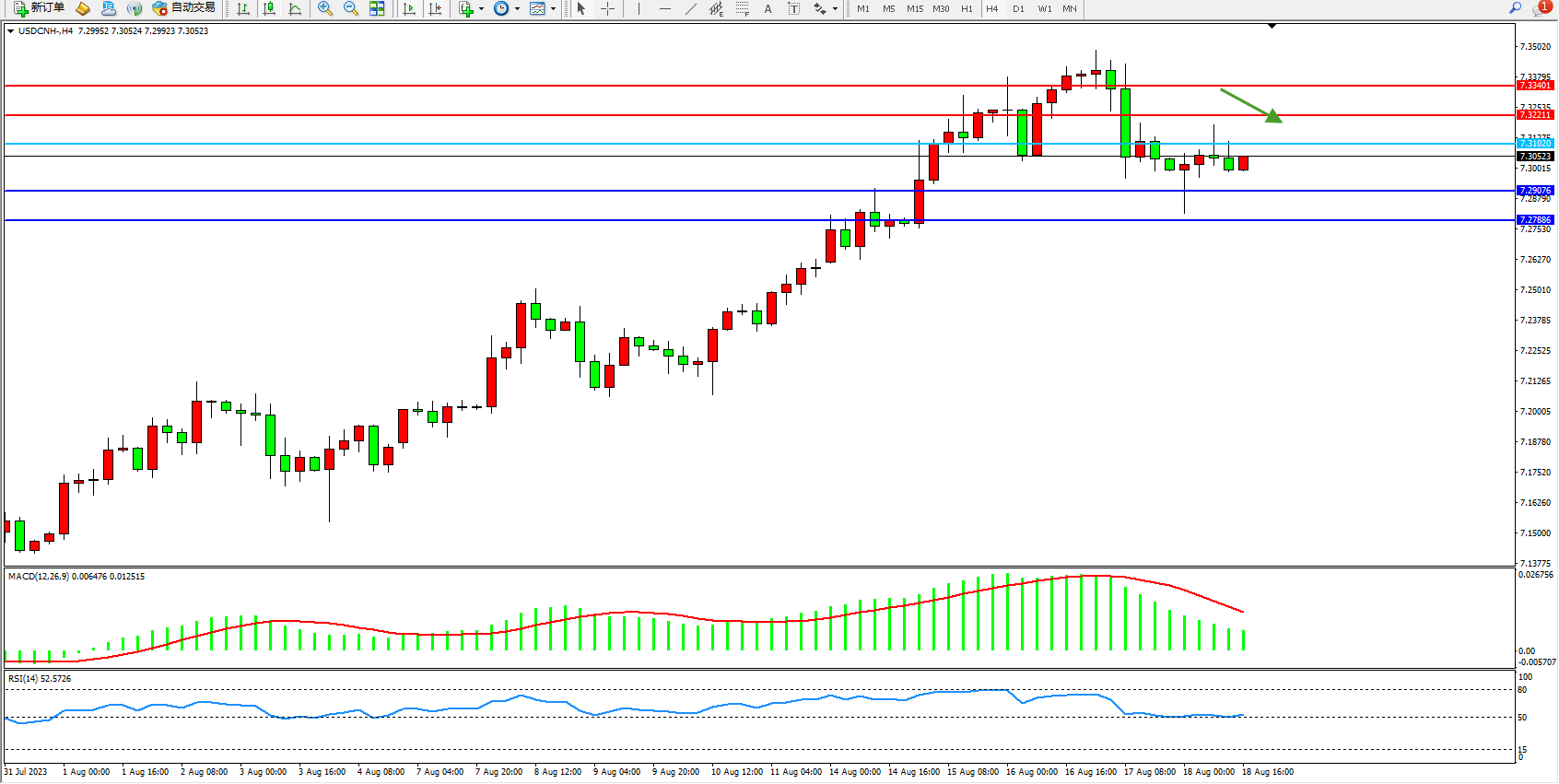 交易策略:7.31020下方看跌,目标7.29076 7.27886