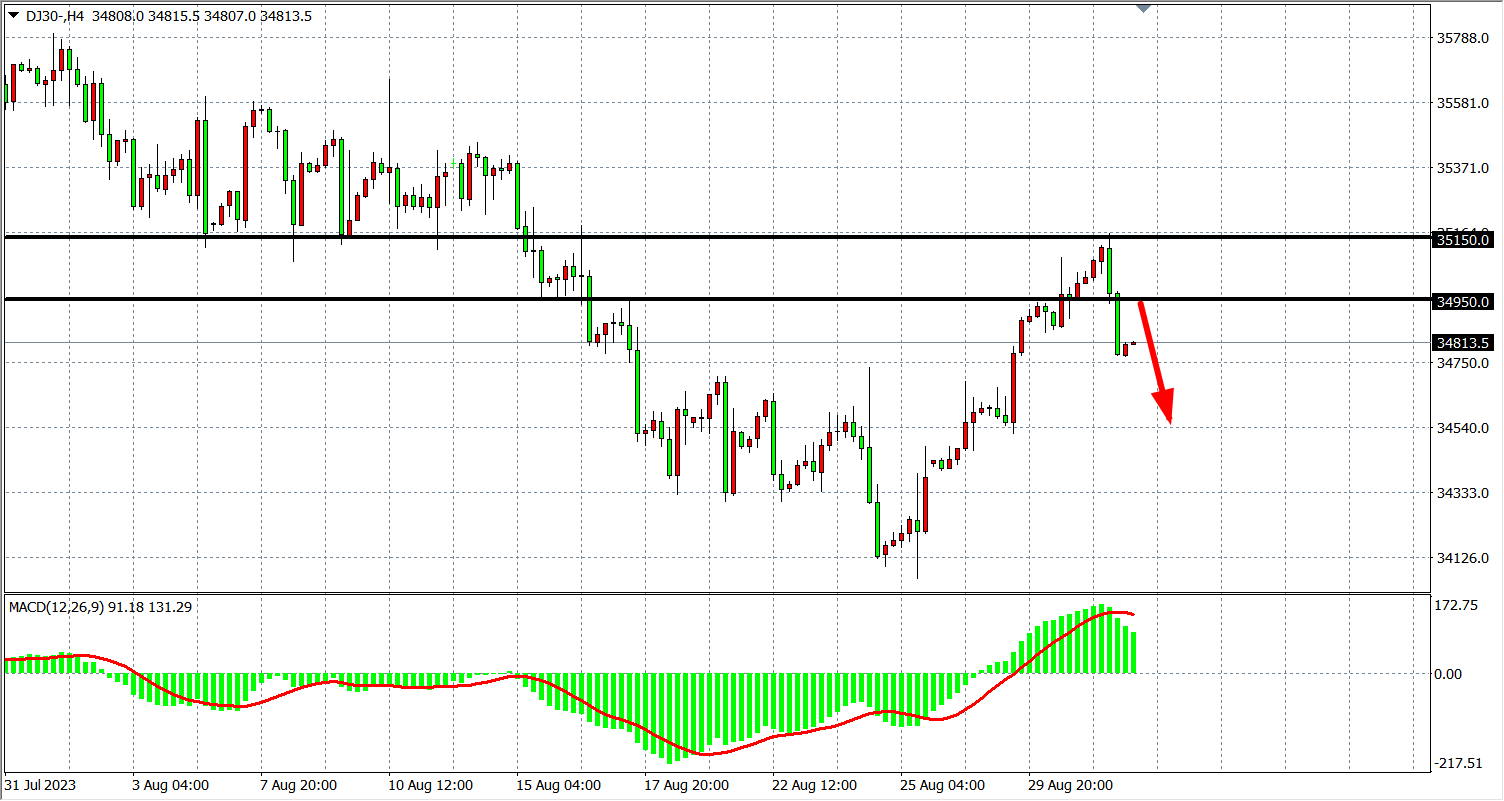 4小时图看,道指反弹35100附近后回落,MACD量能在零轴上有所缩量,短期多头走势偏弱,关注34950-35100的阻力,下方看34500-34300附近。