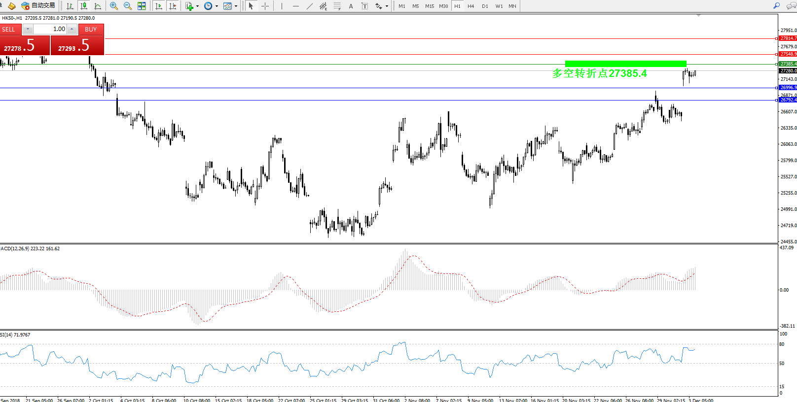 恒指HK50 小时K线图显示: