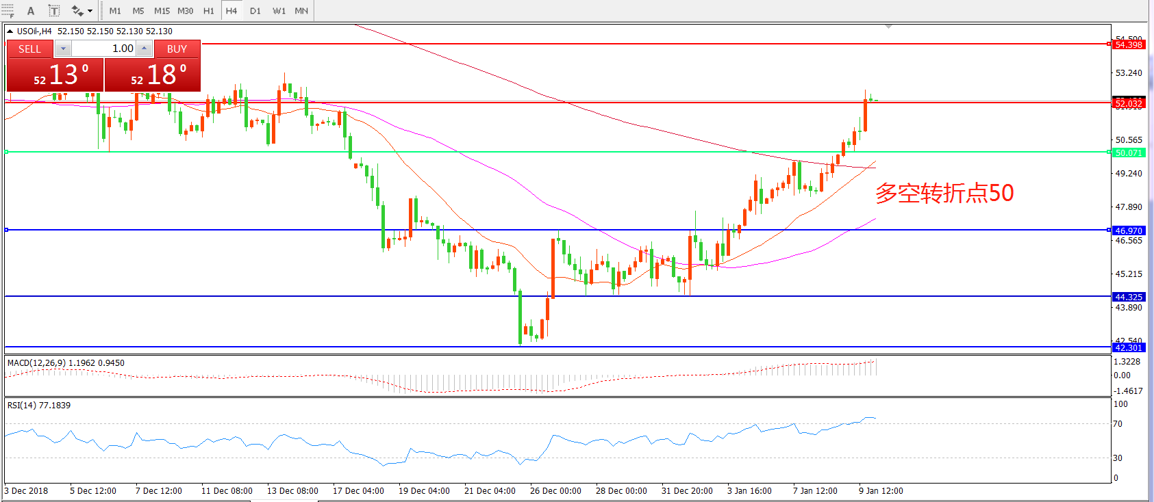 4小时图看,油价站稳50美金后稳步上行, 21与55均线形成金叉,MACD红柱增加,RSI指标处于超买区域,短线有回落风险,但整体走势偏多。