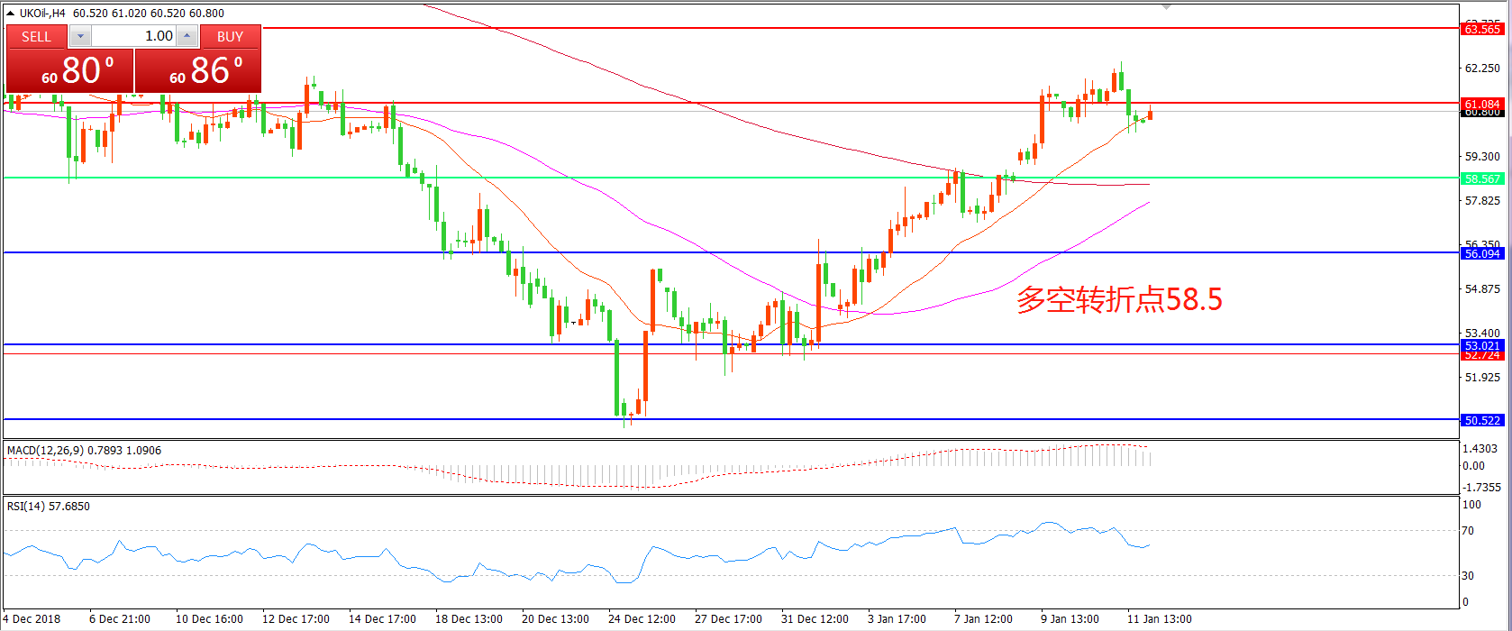 4小时图看,油价站稳58.5美金后稳步上行,冲击61美元后小幅回落, 均线系统呈多头排列,MACD红柱缩短,短线有回落风险,但整体走势偏多。