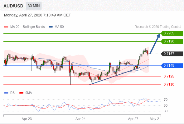 在 0.7145 之上,看涨,目标价位为 0.7190 ,然后为 0.7205 。