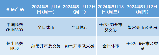 因应2024年9月16日至9月18日为国内及香港中秋节假期,本公司以下产品的交易时间将于假期期间作以下安排,敬请留意。