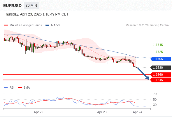 在 1.1705 之下,看跌,目标价位为 1.1660 ,然后为 1.1645 。