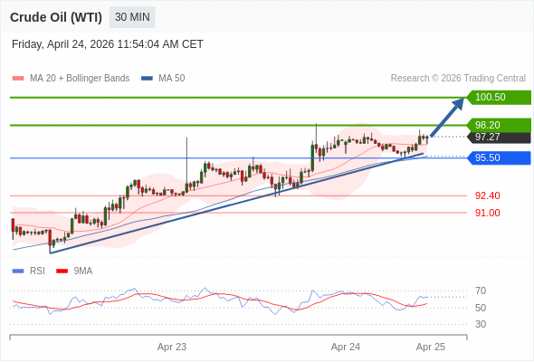 在 95.50 之上,看涨,目标价位为 98.20 ,然后为 100.50 。