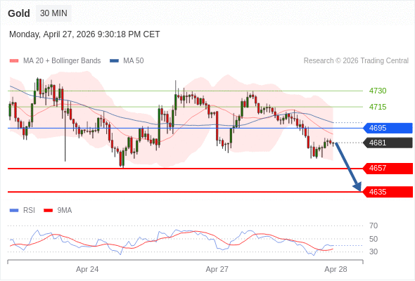 在 4695 之下,看跌,目标价位为 4657 ,然后为 4635 。
