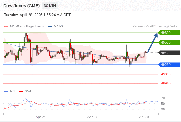 在 49230 之上,看涨,目标价位为 49550 ,然后为 49690 。