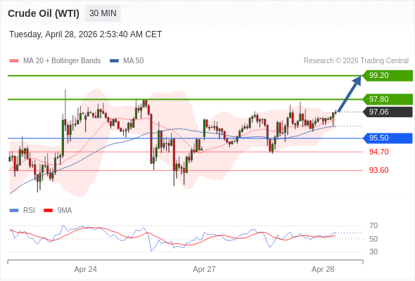 在 95.50 之上,看涨,目标价位为 97.80 ,然后为 99.20 。