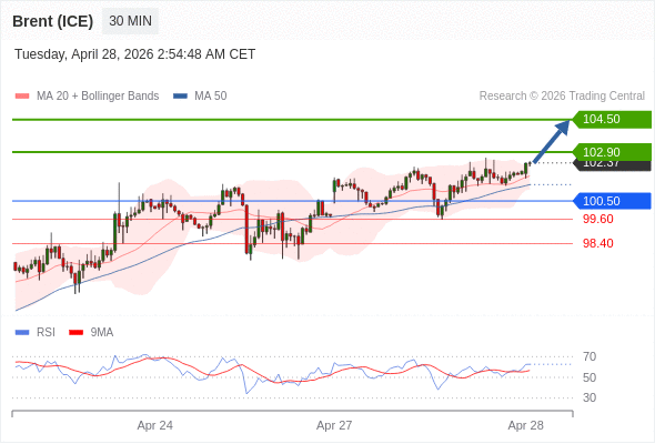在 100.50 之上,看涨,目标价位为 102.90 ,然后为 104.50 。