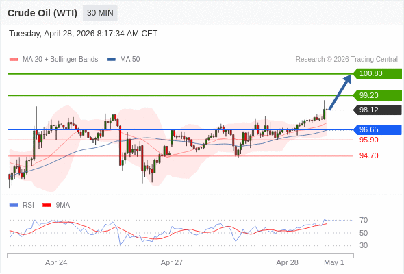 在 96.65 之上,看涨,目标价位为 99.20 ,然后为 100.80 。