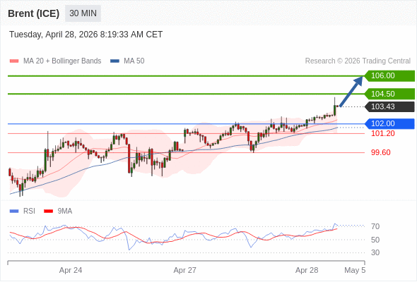 在 102.00 之上,看涨,目标价位为 104.50 ,然后为 106.00 。