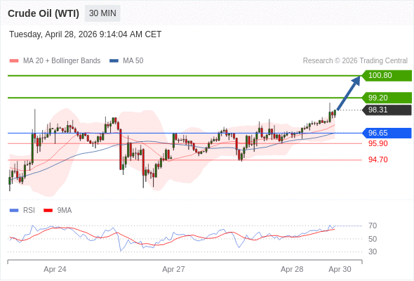 在 96.65 之上,看涨,目标价位为 99.20 ,然后为 100.80 。