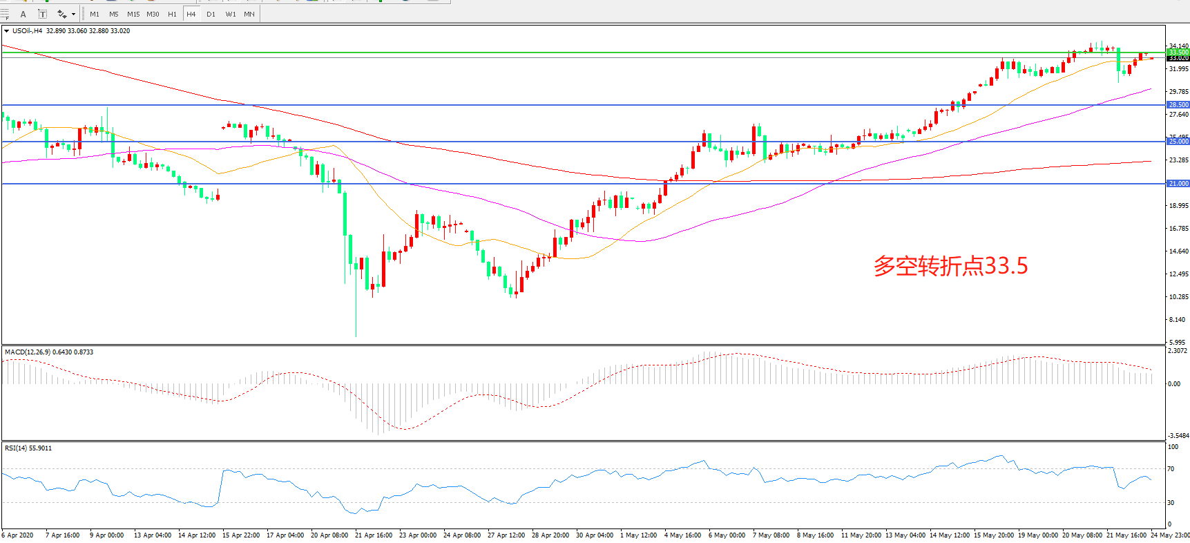 4小时图看,油价延续高位震荡,33.5成为上方短期阻力,55周期均线成为下方支撑,均线系统仍呈多头排列,MACD红柱增加,RSI指标向上,日内延续震荡概率较大。