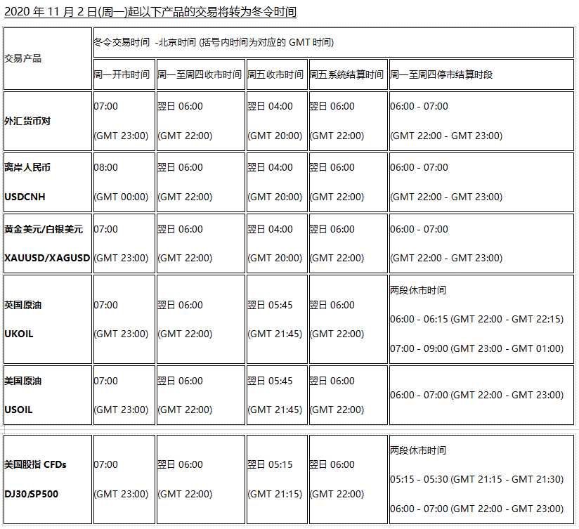 因应欧洲市场将于2020年10月26日(周一)及北美市场将于2020年11月2日(周一)开始分别转入冬令时时间, 以下欧美市场各产品交易时间将调整为冬令时交易时间,敬请阁下留意知悉!