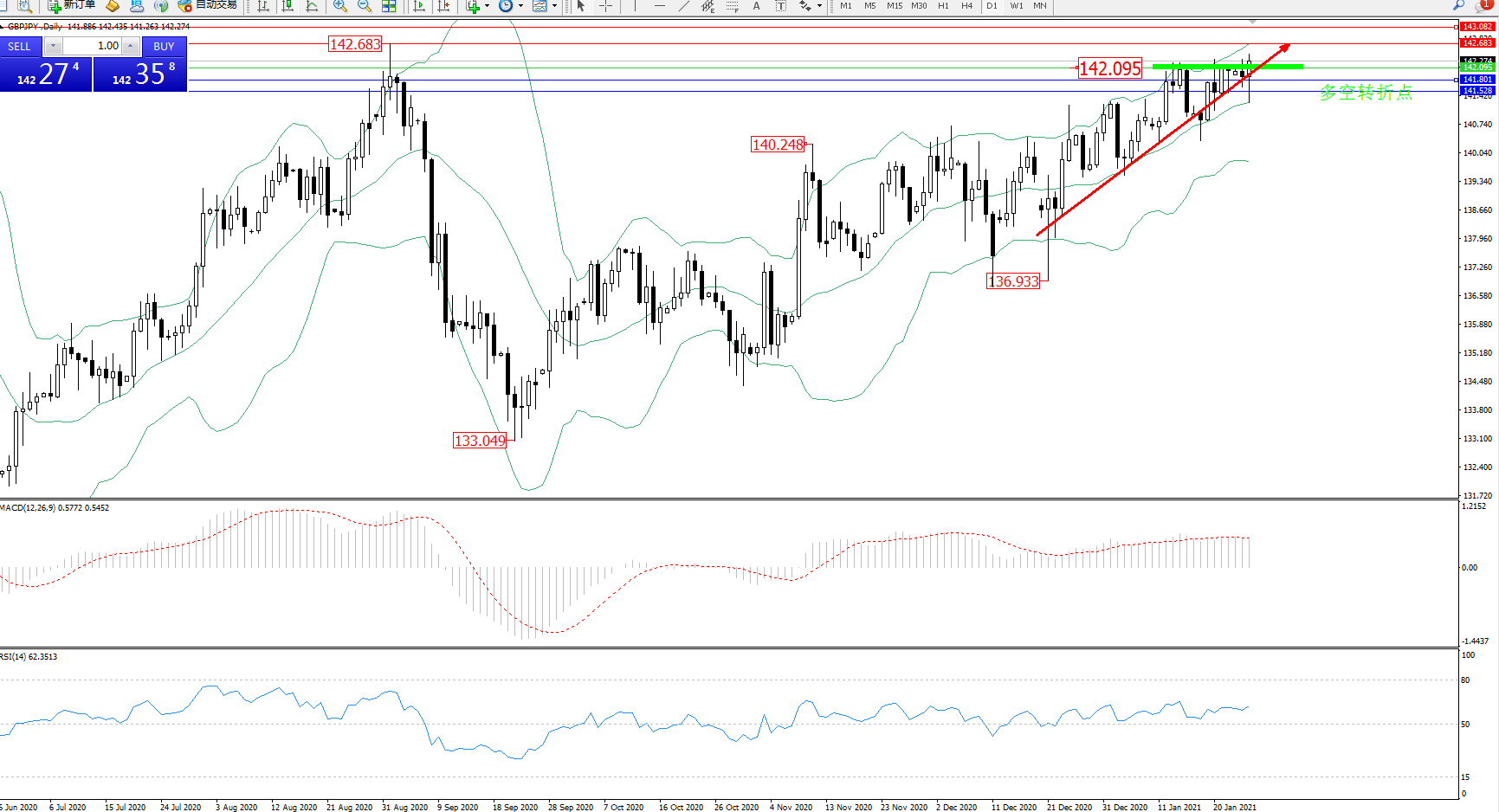 英镑兑日圆高位142.274附近持续震荡有继续拉升态势,英国央行似乎有意避免负利率,行长提到了这方面的“许多问题”,由于英国央行不愿下调利率,预计该央行将面临压力,考虑小幅降息10个基点,以便在依赖疫苗的复苏进入下半年之前提供刺激措施,人们担心美国总统拜登1.9万亿美元刺激计划将遇阻,这提升了美元的避险买盘,参议院多数党领袖舒默周一警告称,经济刺激法案可能在四到六周内无法通过,3月中旬之前不可能通过,这进一步证实了拜登刺激方案在国会面临的处境。高盛已经将拜登最终能通过的刺激计划规模从1.9万亿美元削减至1.1万亿美元,摩根大通的Andrew Tyler更是悲观地认为,最终能通过的规模只有9000亿美元,而且可能会被延迟很久。