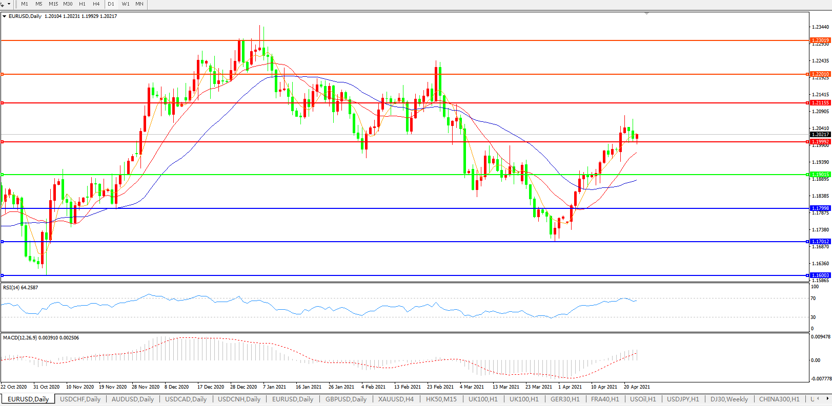 技术面简析:日均线呈多头排列汇价上行遭遇压力回踩持续整理,MACD上穿0轴且量能有小幅放量迹象RSI小幅走弱,预计短期汇价大概率在整理后进一步上行