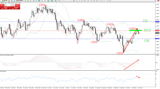 低位多头动力持续震荡上扬,高位抵达1.38351位置后遇阻得到短期压制,空头动力伺机入场,短期出现回撤下行走势,布林带指标呈张口走势持续后开始有收口迹象,上方压制关注1.39541附近,低位支撑关注1.36590附近,关注1.37976附近转折点,MACD指标低位多头动力持续震荡上扬至0轴线上方多头区域持续上移中,RSI指标处于多头区域维持窄整理后有下行迹象,如图: