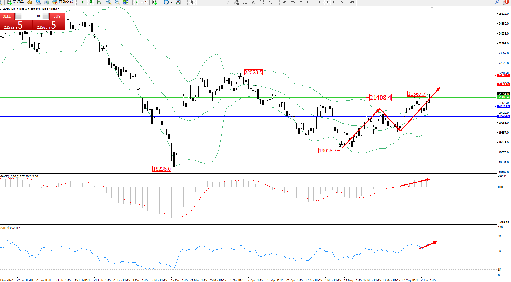 恒指HK50 ——4小时K线图显示: