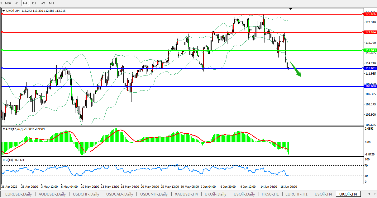 美油期货下跌6.8%,结算价报109.56美元/桶,创3月底以来最大跌幅,盘中一度大跌7.9%至108.3。人们担心主要央行加息可能放缓全球经济并削减对能源的需求,推动油价下行。