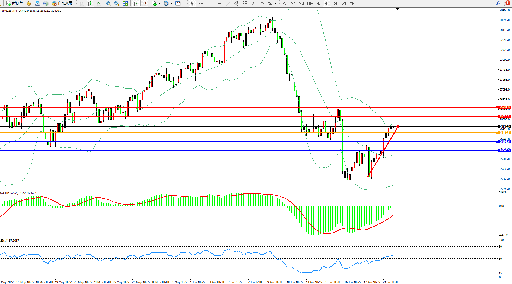 日经指数JPN225——4小时K线图显示: