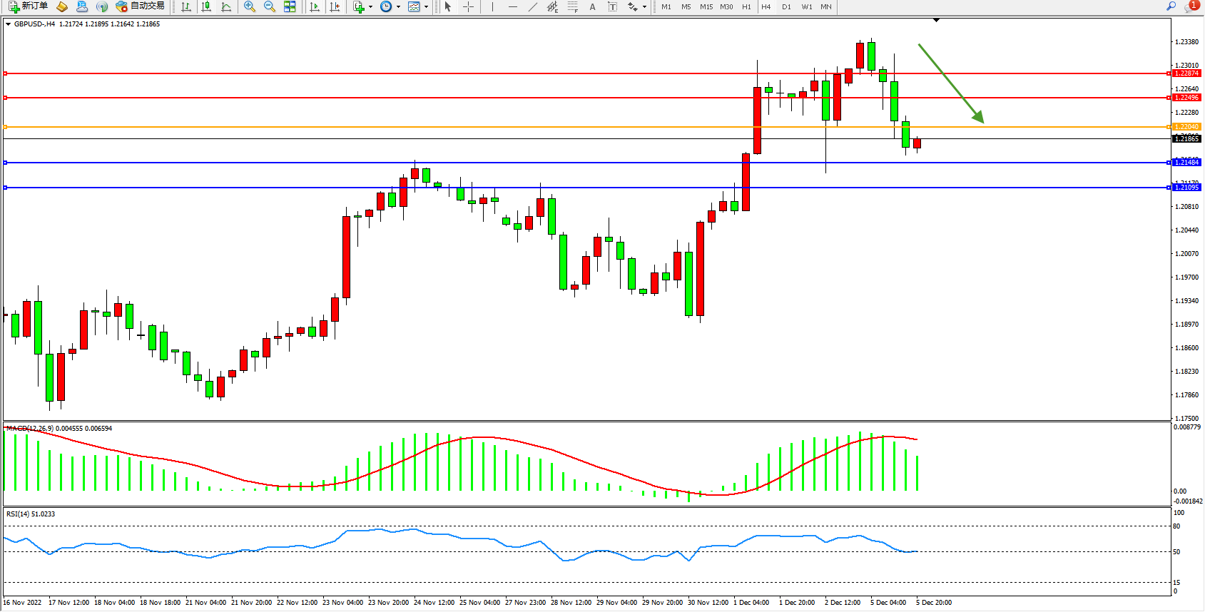 交易策略:1.22040下方看跌,目标1.21484、1.21095