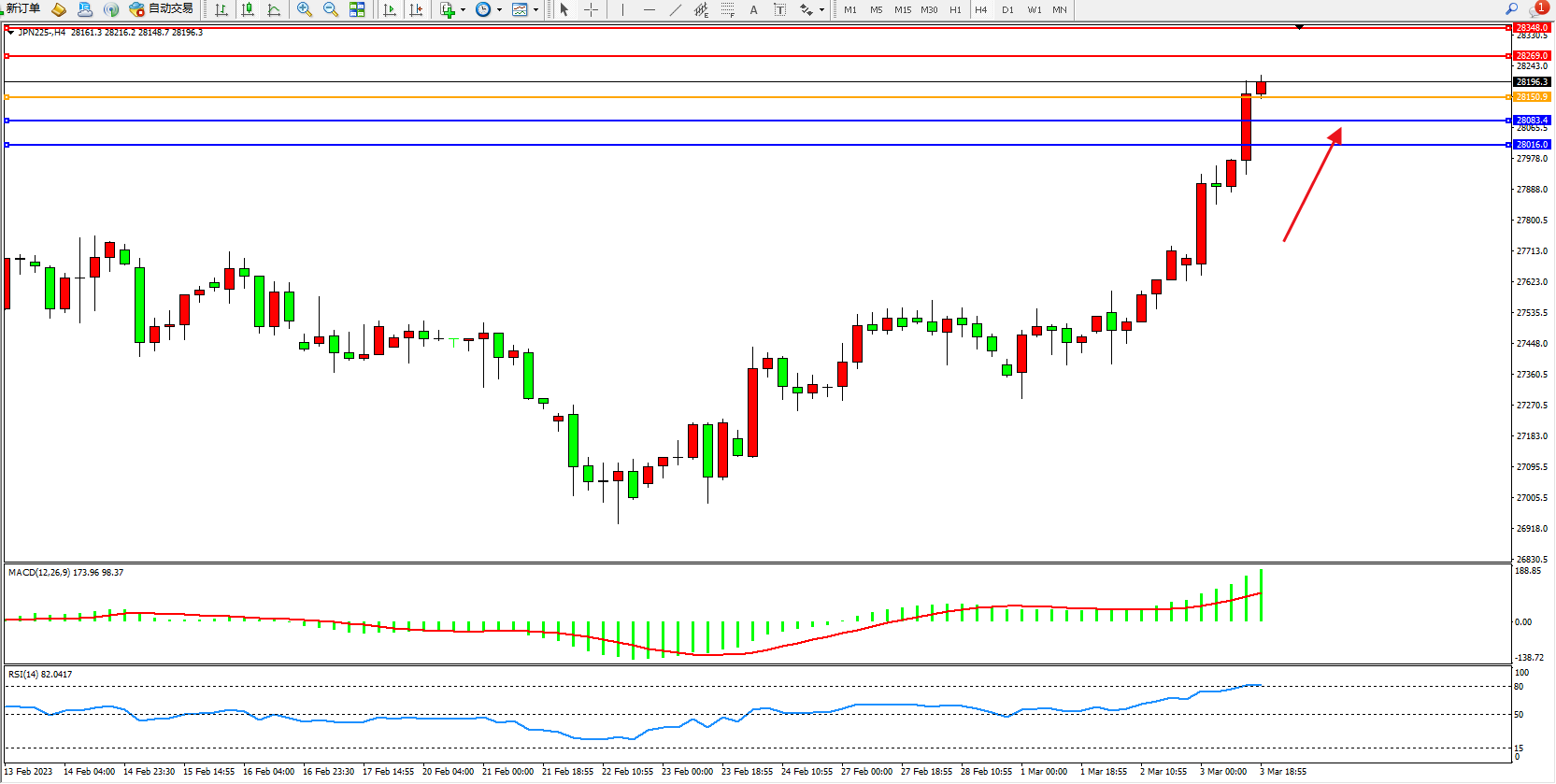 日经指数JPN225——4小时K线图显示: