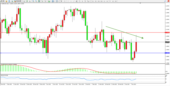 空头下行趋势态势良好,低位短期快速回升,但下行趋势依旧,上方压制关注1.21405附近,低位支撑关注1.19045附近,MACD指标处于0轴线下侧徘徊,RSI指标处于50均衡线附近弱势整理,如图: