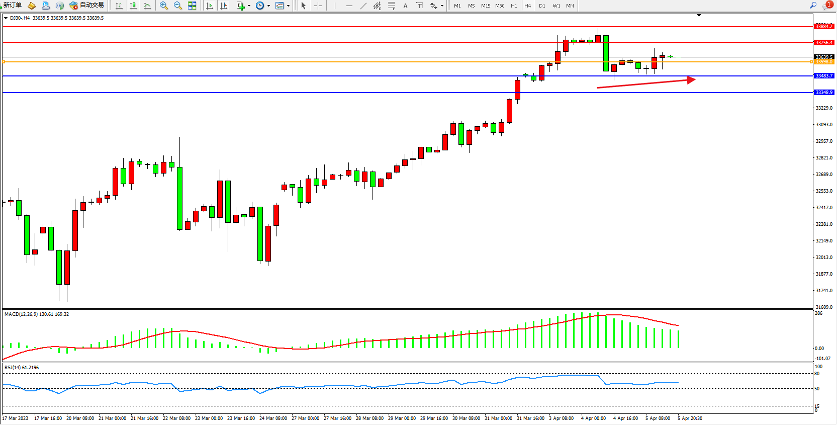 道琼斯指数DJ30——4小时K线图显示:
