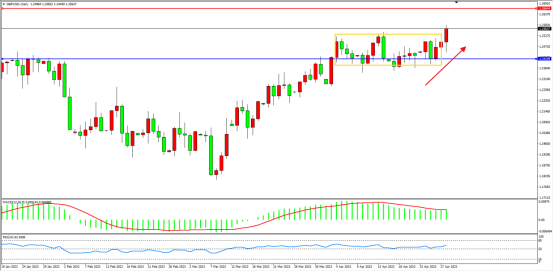 短期突破关键区间震荡走势区间,多头动力有继续向上移动迹象,上方压制关注1.26644附近,低位支撑关注1.24109附近,市场多头情绪依旧,MACD指标处于多头区域维持整理,RSI指标处于50均衡线上側弱势徘徊,如图: