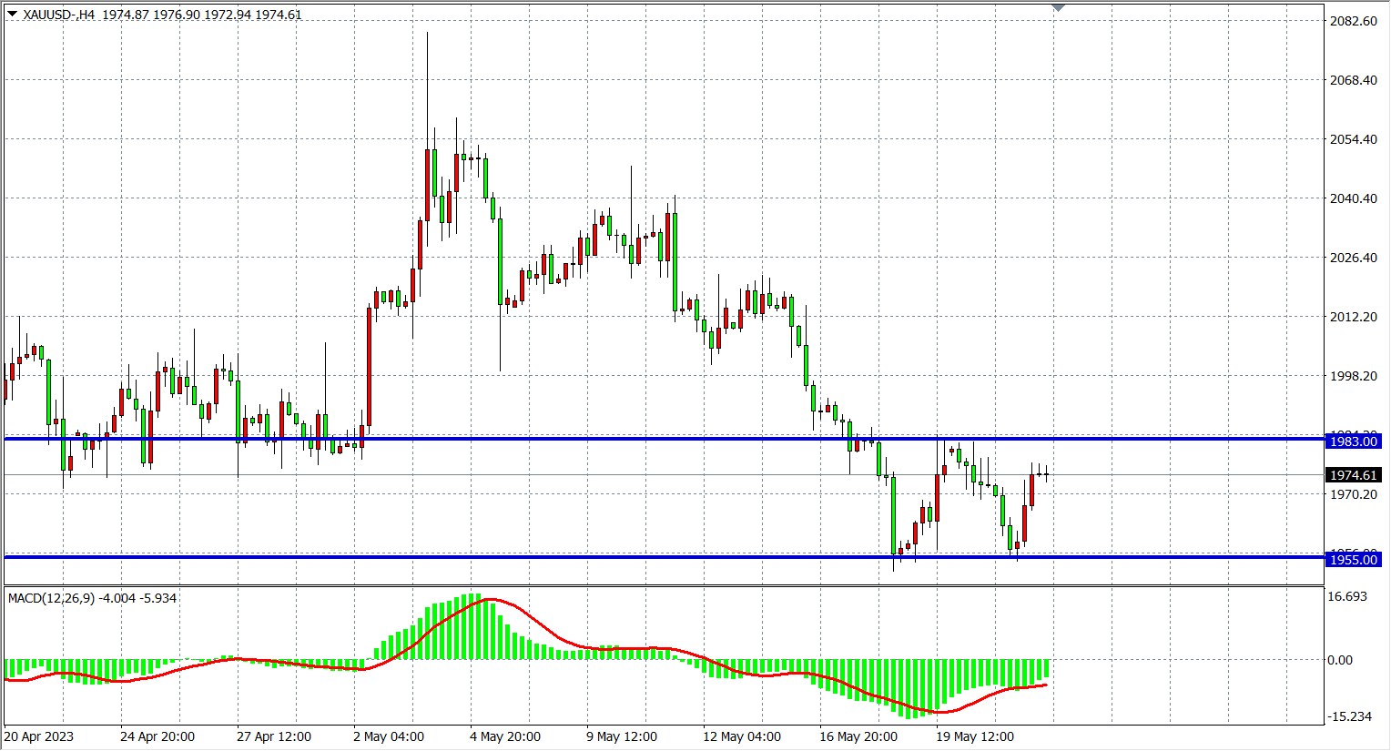 周二(5月23日)由于新一轮债务上限谈判缺乏进展,且数据表明美国制造业重陷萎缩,现货黄金县长后跌,走出V型反弹,最终收涨0.29%。展望后市,由于围绕美国债务上限讨论的不确定性仍存,金价走势仍较为动荡。