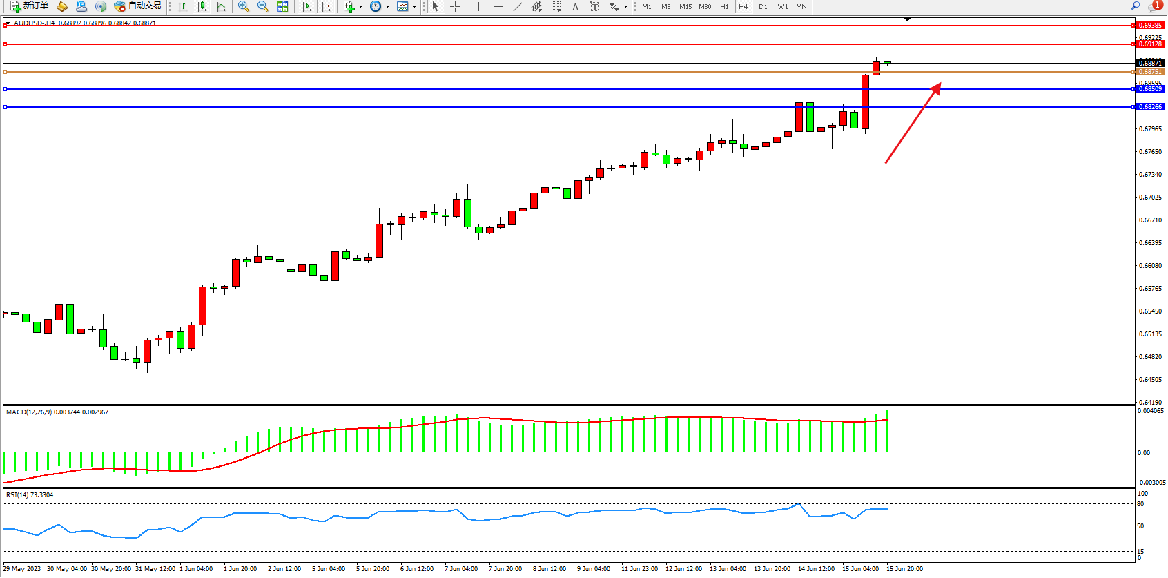 交易策略:0.68751上方看涨,目标0.69128  0.69385